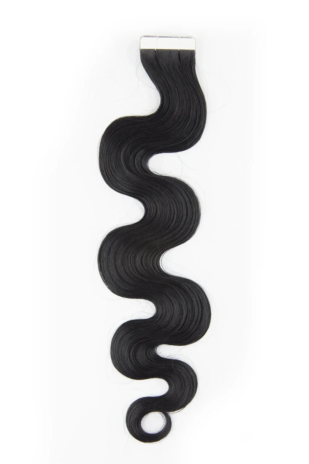 Our Virgin Burmese Body Wave Tape Ins. These tape ins feature a beautiful body wave texture, characterized by loose and flowing waves that exude elegance and sophistication. Easy to attach for added length and volume captivating body wave pattern.